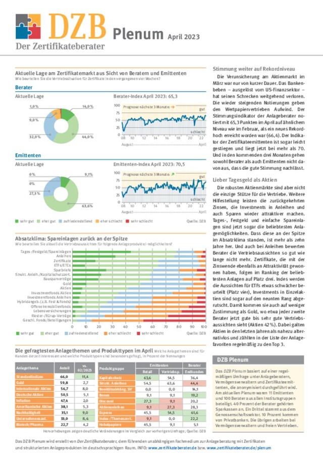 Das DZB Plenum basiert auf einer regelmäßigen Umfrage zur Stimmungslage am deutschen Zertifikatemarkt. Einmal monatlich befragt die Fachzeitschrift Der Zertifikateberater im Rahmen einer anonymen Onlinebefragung zum einen Anlageberater und Vermögensverwalter und zum anderen die Anbieter strukturierter Produkte nach ihrer Markteinschätzung und den gefragtesten Anlagethemen. In der Auswertung bietet das Plenum daher eine einmalige Indikation für die Lage am Zertifikatemarkt.