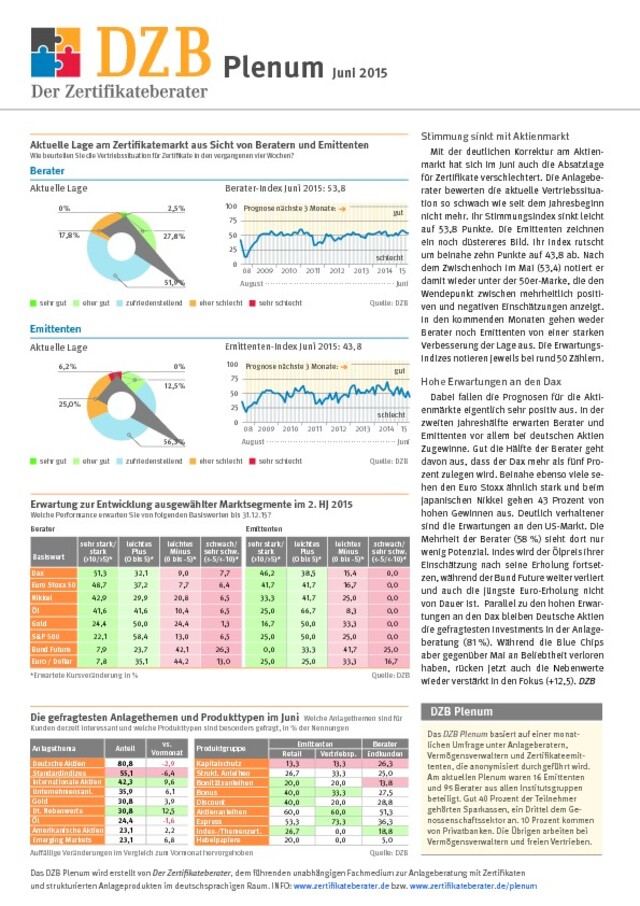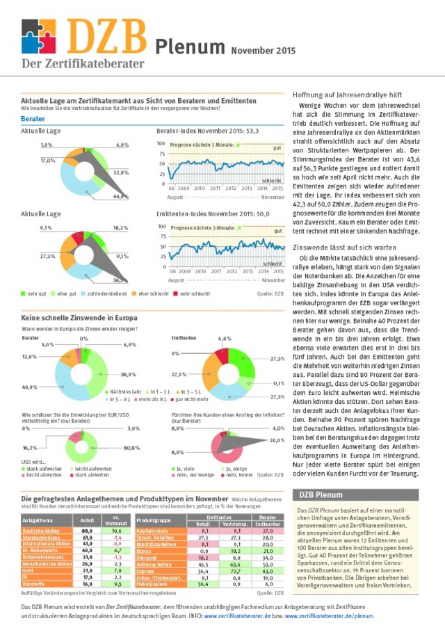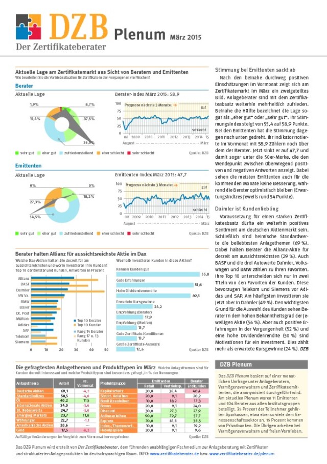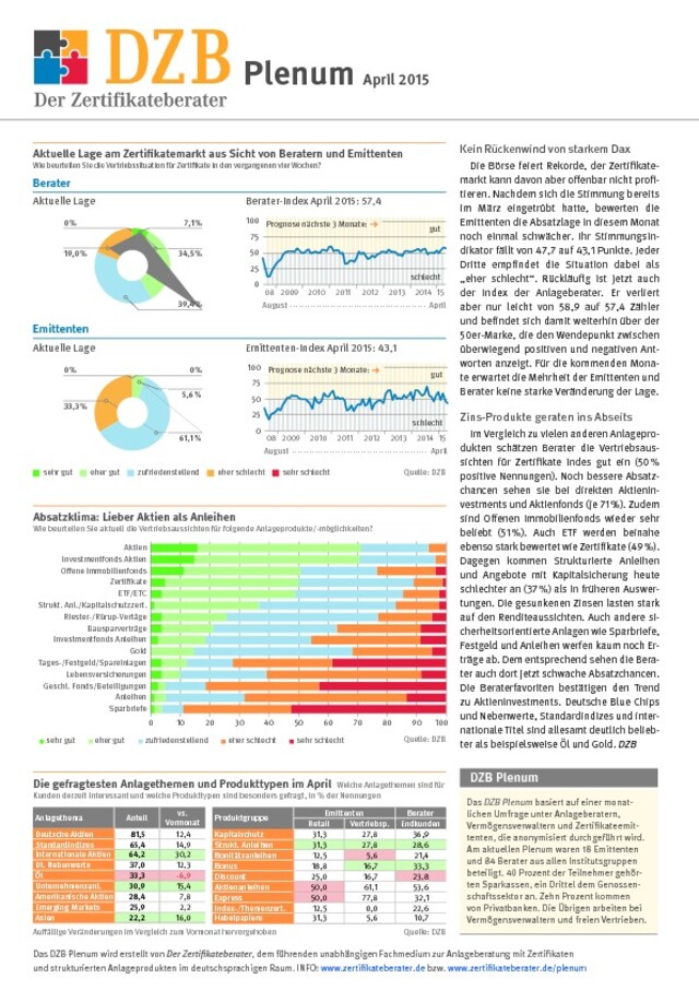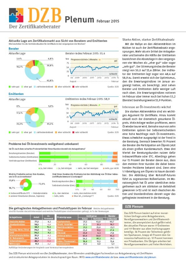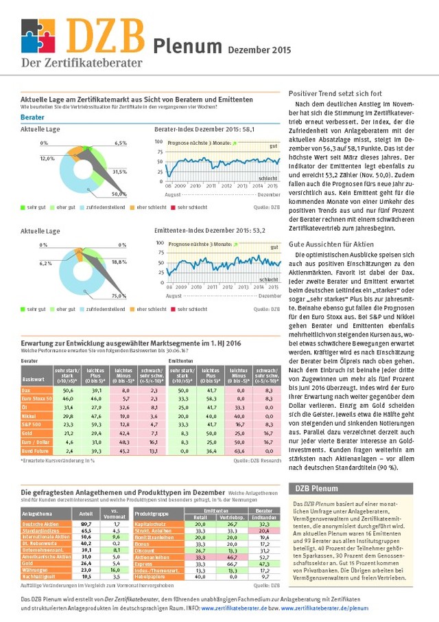 Das DZB Plenum basiert auf einer regelmäßigen Umfrage zur Stimmungslage am deutschen Zertifikatemarkt. Einmal monatlich befragt die Fachzeitschrift Der Zertifikateberater im Rahmen einer anonymen Onlinebefragung zum einen Anlageberater und Vermögensverwalter und zum anderen die Anbieter strukturierter Produkte nach ihrer Markteinschätzung und den gefragtesten Anlagethemen. In der Auswertung bietet das Plenum daher eine einmalige Indikation für die Lage am Zertifikatemarkt.