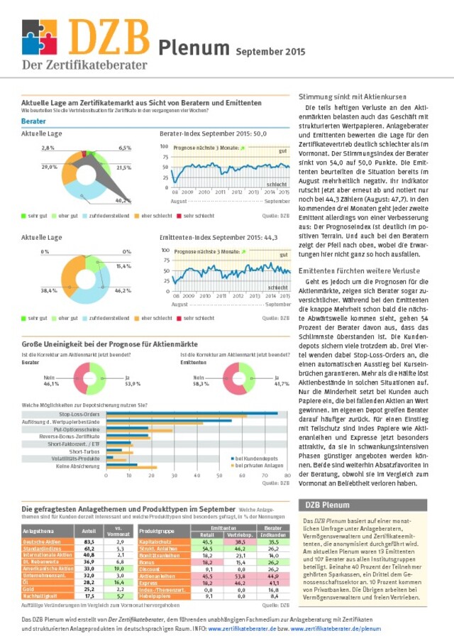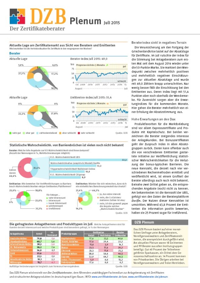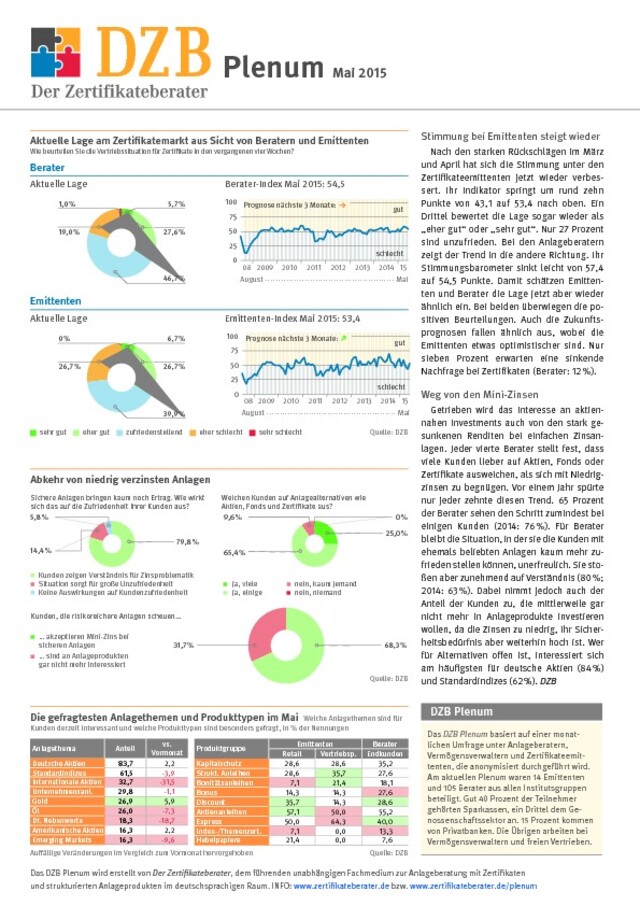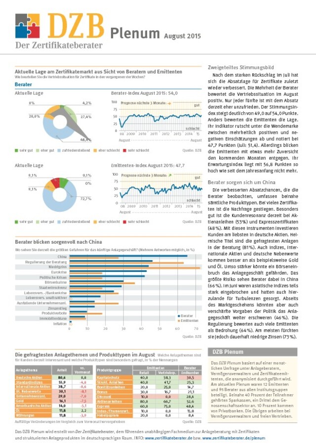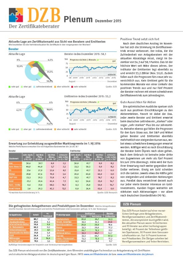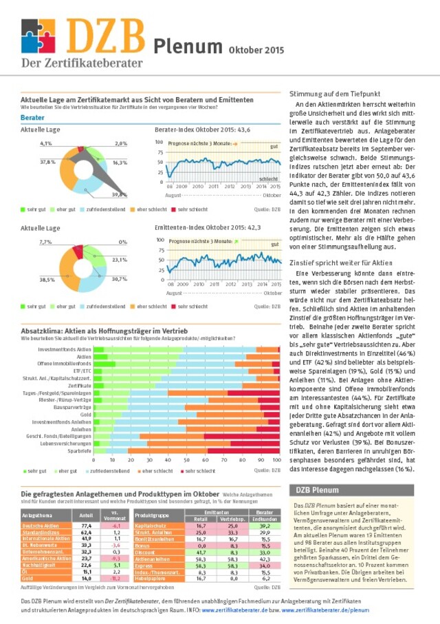Das DZB Plenum basiert auf einer regelmäßigen Umfrage zur Stimmungslage am deutschen Zertifikatemarkt. Einmal monatlich befragt die Fachzeitschrift Der Zertifikateberater im Rahmen einer anonymen Onlinebefragung zum einen Anlageberater und Vermögensverwalter und zum anderen die Anbieter strukturierter Produkte nach ihrer Markteinschätzung und den gefragtesten Anlagethemen. In der Auswertung bietet das Plenum daher eine einmalige Indikation für die Lage am Zertifikatemarkt.