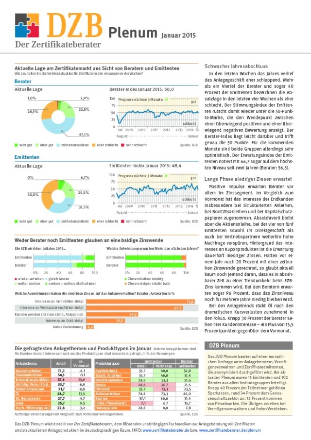 Anlageberater und Emittenten halten baldige Zinswende in Europa für nahezu ausgeschlossen – Beratungskunden wenden sich Immobilien und Aktien zu – Preisverfall beim Öl lockt zum Einstieg – Positiver Ausblick für den Absatz von Zertifikaten