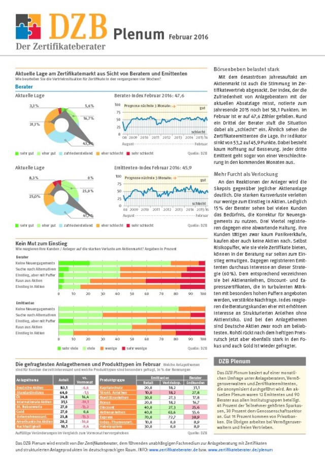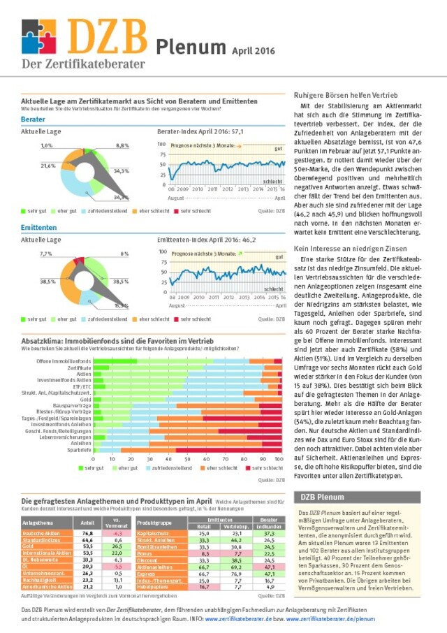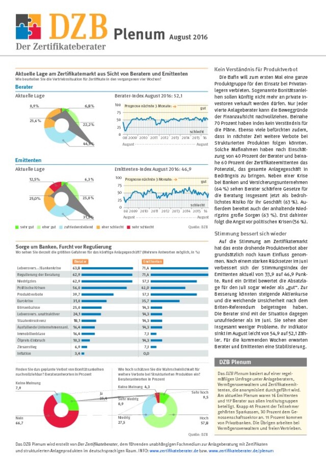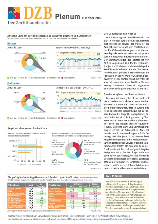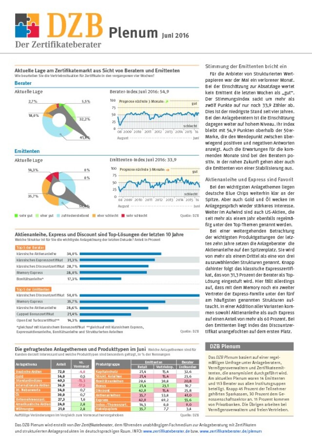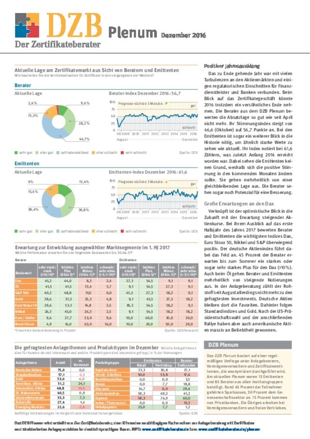 Das DZB Plenum basiert auf einer regelmäßigen Umfrage zur Stimmungslage am deutschen Zertifikatemarkt. Einmal monatlich befragt die Fachzeitschrift Der Zertifikateberater im Rahmen einer anonymen Onlinebefragung zum einen Anlageberater und Vermögensverwalter und zum anderen die Anbieter strukturierter Produkte nach ihrer Markteinschätzung und den gefragtesten Anlagethemen. In der Auswertung bietet das Plenum daher eine einmalige Indikation für die Lage am Zertifikatemarkt.