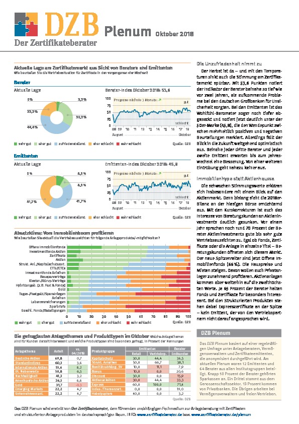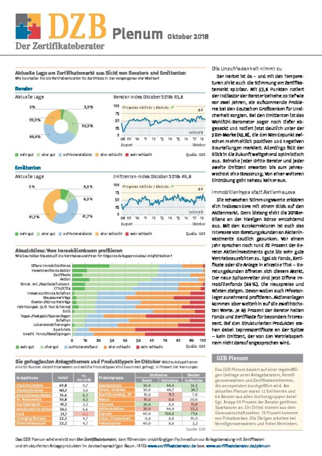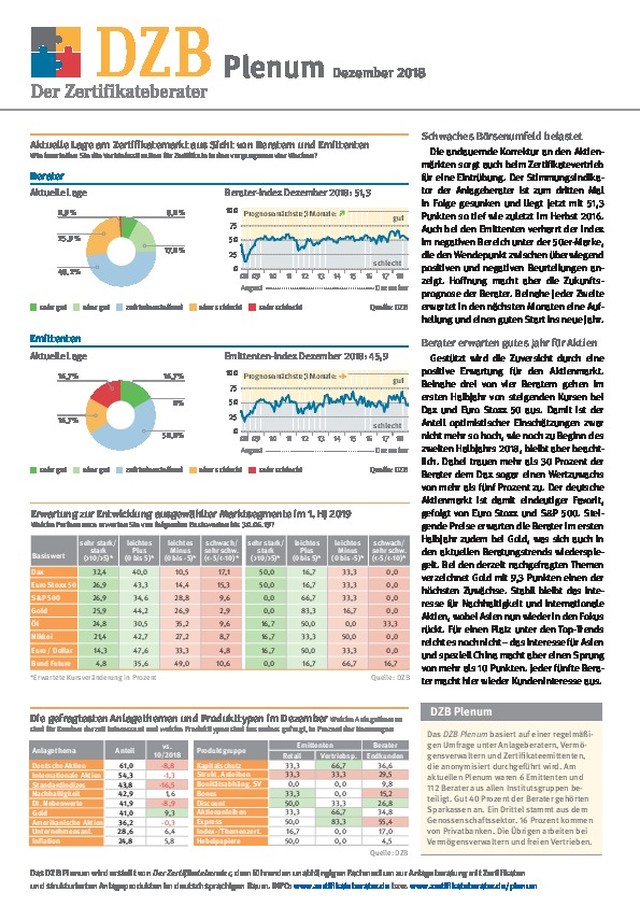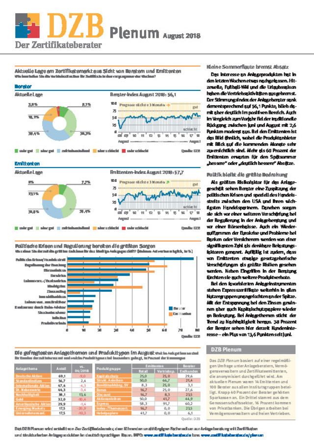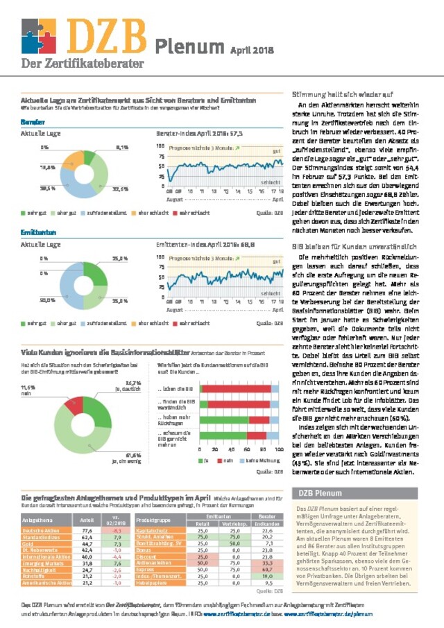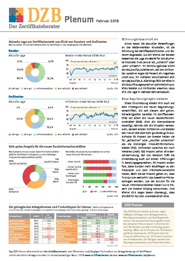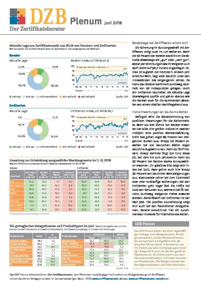 Das DZB Plenum basiert auf einer regelmäßigen Umfrage zur Stimmungslage am deutschen Zertifikatemarkt. Einmal monatlich befragt die Fachzeitschrift Der Zertifikateberater im Rahmen einer anonymen Onlinebefragung zum einen Anlageberater und Vermögensverwalter und zum anderen die Anbieter strukturierter Produkte nach ihrer Markteinschätzung und den gefragtesten Anlagethemen. In der Auswertung bietet das Plenum daher eine einmalige Indikation für die Lage am Zertifikatemarkt.