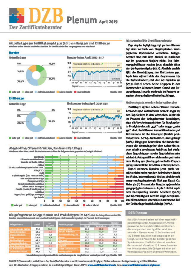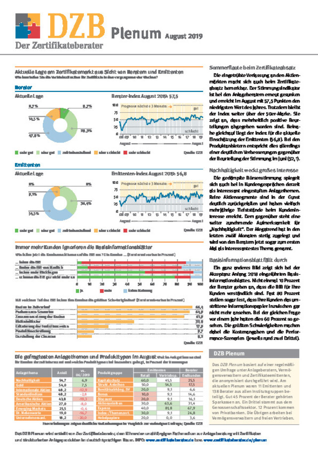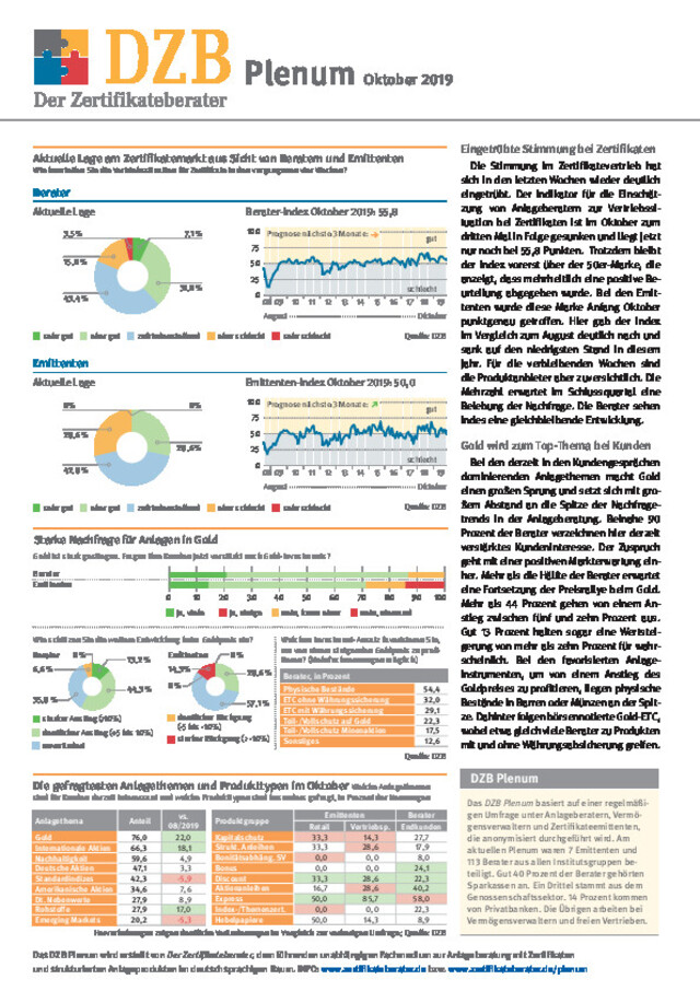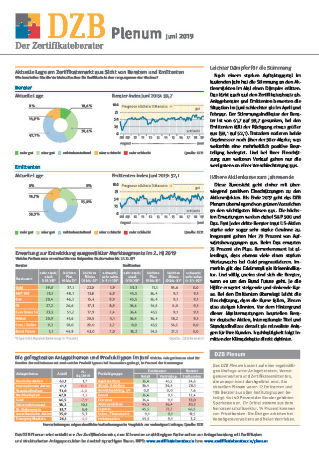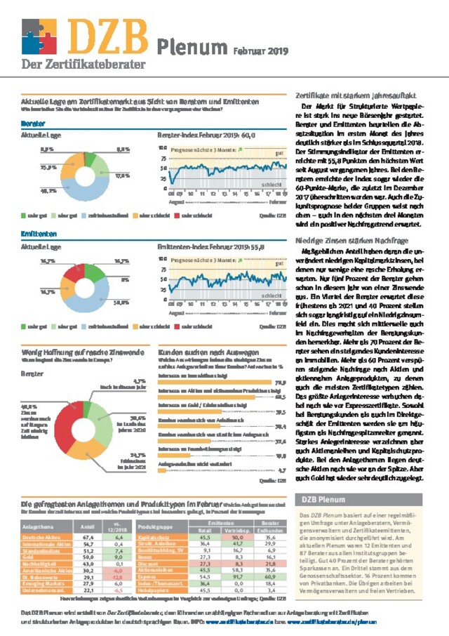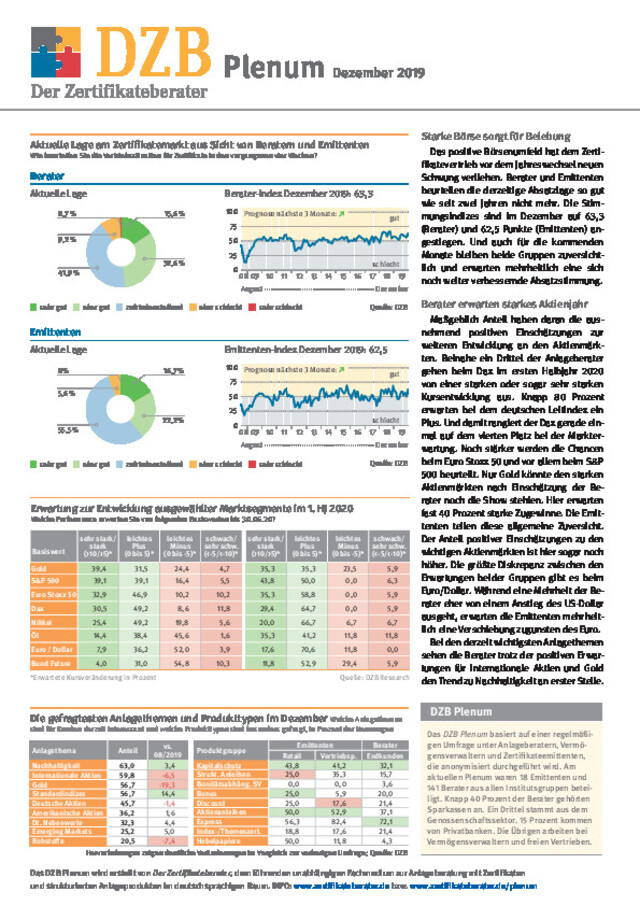 Das DZB Plenum basiert auf einer regelmäßigen Umfrage zur Stimmungslage am deutschen Zertifikatemarkt. Einmal monatlich befragt die Fachzeitschrift Der Zertifikateberater im Rahmen einer anonymen Onlinebefragung zum einen Anlageberater und Vermögensverwalter und zum anderen die Anbieter strukturierter Produkte nach ihrer Markteinschätzung und den gefragtesten Anlagethemen. In der Auswertung bietet das Plenum daher eine einmalige Indikation für die Lage am Zertifikatemarkt.