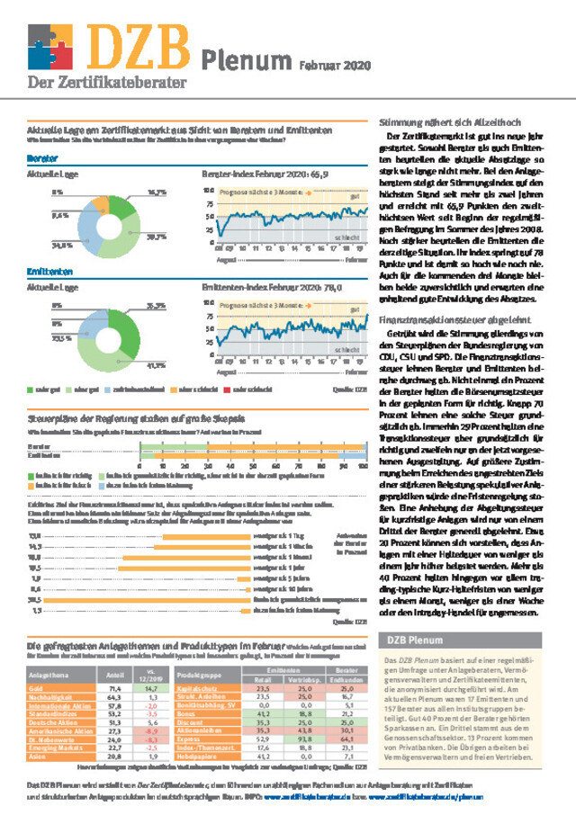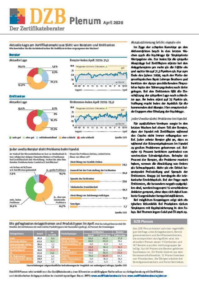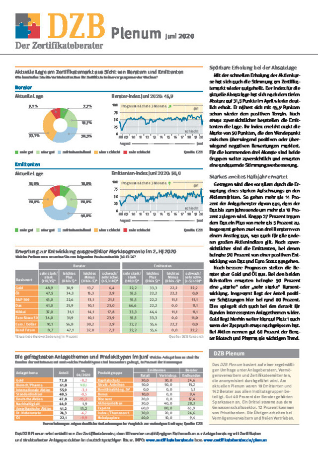 Das DZB Plenum basiert auf einer regelmäßigen Umfrage zur Stimmungslage am deutschen Zertifikatemarkt. Einmal monatlich befragt die Fachzeitschrift Der Zertifikateberater im Rahmen einer anonymen Onlinebefragung zum einen Anlageberater und Vermögensverwalter und zum anderen die Anbieter strukturierter Produkte nach ihrer Markteinschätzung und den gefragtesten Anlagethemen. In der Auswertung bietet das Plenum daher eine einmalige Indikation für die Lage am Zertifikatemarkt.